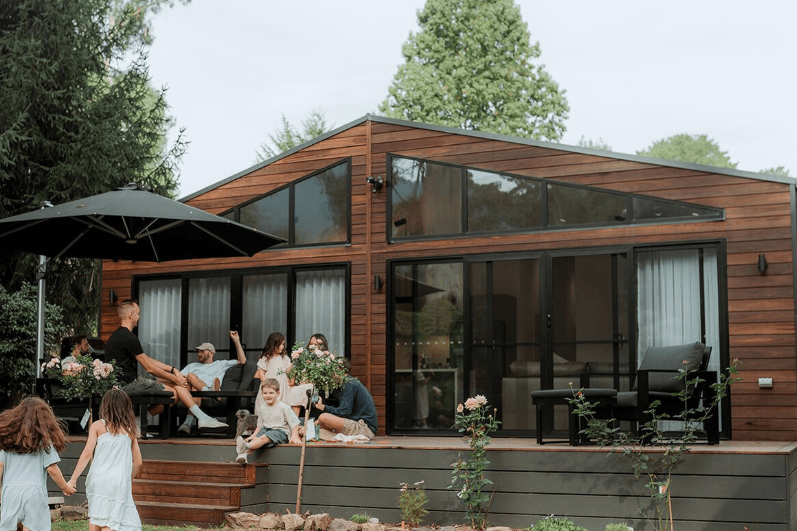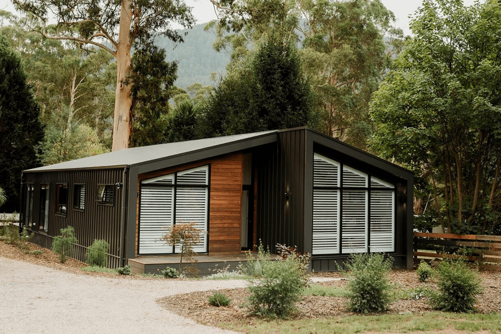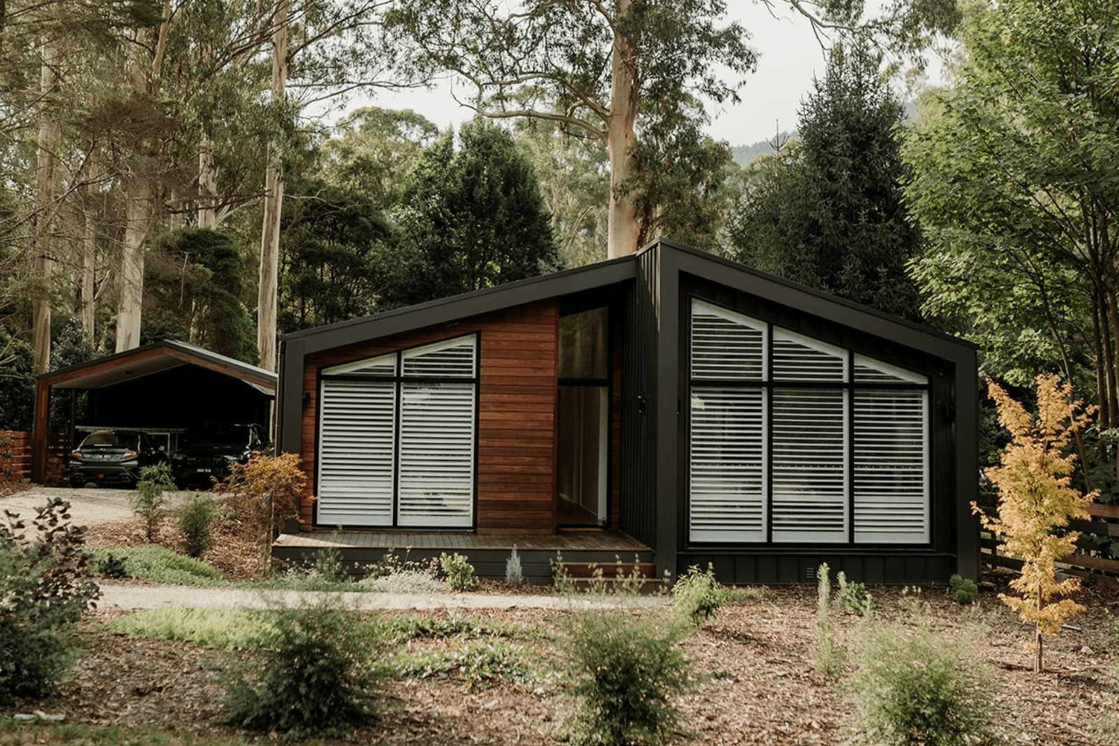 Set against the breathtaking backdrop of Warburton, this striking four-bedroom, two-bathroom home is a beautifully modified version of our Aspendale design. Featuring a refined Modern Gable façade, bold Spotted Gum and Nailstrip cladding, and soaring gable windows that invite the outdoors in, the home blends modern style with natural warmth. Expansive open-plan living connects seamlessly to a rear deck, capturing views of the Yarra Ranges and creating an ideal space for relaxed living and easy entertaining.